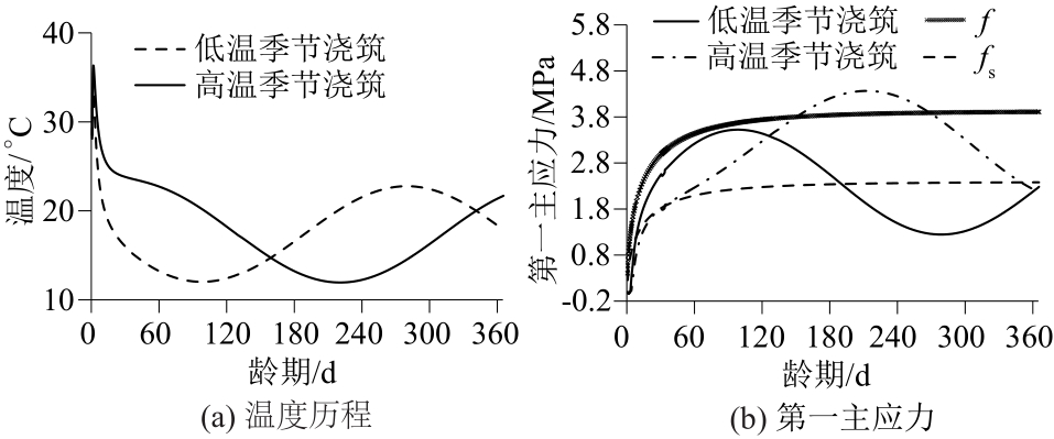 隧洞衬砌混凝土属于典型的薄壁大体积混凝土,衬砌采用泵送混凝土、水化温升高,围岩约束大,衬砌易产生温度裂缝。为探究合理的隧洞衬砌施工期温控措施,采用三维有限元软件,考虑围岩和衬砌接触,开展了滇中引水工程某隧洞混凝土典型衬砌段施工期的温度场和温度应力场分布规律分析。结合现场监测数据,反馈分析了衬砌段表面保温系数为16.7 kJ/(m2·h·℃)。研究了不同的浇筑温度、浇筑段长度、浇筑季节、混凝土自生体积变形特性对混凝土衬砌温度应力场的影响。结果显示:浇筑温度越高温度应力越大,浇筑温度每升高4 ℃,最小抗裂安全度降低0.30;高温季节浇筑最大应力较大,甚至>3.5 MPa;衬砌结构应采用合适的分段长度;采用微膨胀混凝土有利于抗裂。研究成果可为滇中引水工程隧洞衬砌混凝土温控施工提供参考。