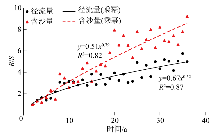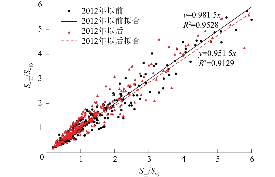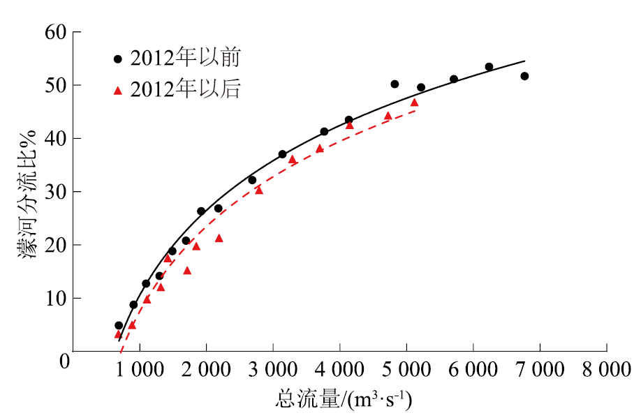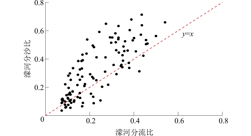 为明确淮河中游典型分汊河道水沙特性变化及分水分沙规律,采用累积距平、M-K分析法、R/S分析法和Morlet小波分析法等方法,研究了分汊河道濛洼段1985—2020年来水来沙特性,探讨了水沙条件突变及变化趋势的驱动因素,基于水沙关系曲线分析了水沙协同关系与输沙能力的变化,定量给出了濛洼段各汊分流比和含沙量比。结果表明:王家坝站(总)年径流量总体未呈明显增减趋势,含沙量则表现出明显的减小趋势,未来一段时间继续呈减小趋势,在1995年左右发生突变,水库拦沙、农业种植改变下垫面及水土保持措施是含沙量减小的主要驱动因素;来沙系数呈减少趋势,外界影响系数a值逐渐减少,输沙特性拟合系数b值逐渐增大;濛河分流比与本段总来流基本呈正相关,随着流量增加,濛河分流的权重也逐渐升高,6 000 m3/s流量级以下分流能力略有萎缩,6 000 m3/s流量级可以与淮河干流平分上游来流,各汊点河道的含沙量比值近似等于各河道的水流挟沙力比值。以上结果为淮河中游水沙数值模拟中分汊河道含沙量计算模式提供理论支撑,为淮河中游河道整治采用长距离疏浚方案提供科学依据。