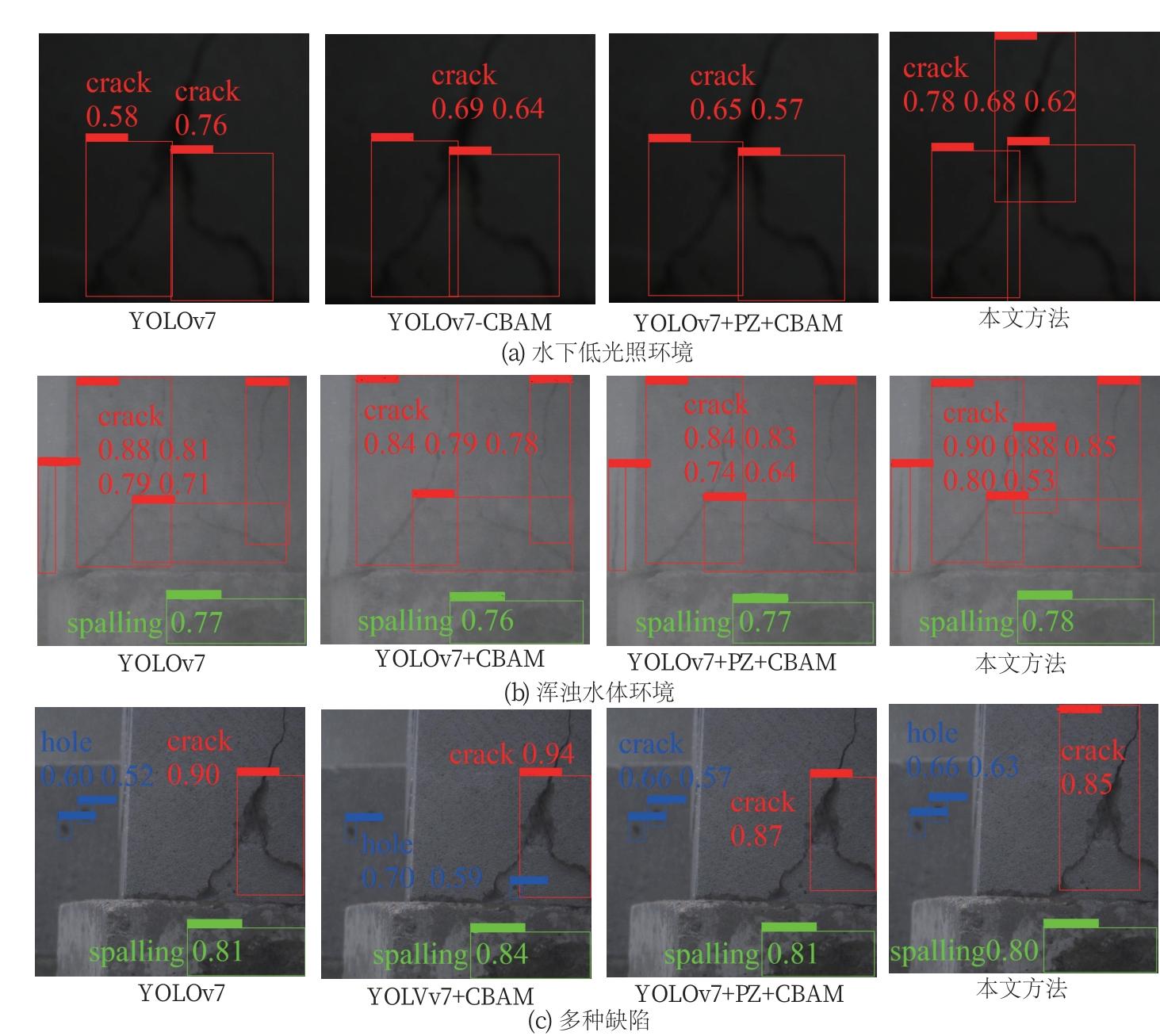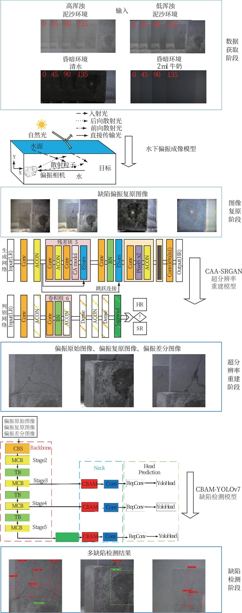 浅水环境常呈现浑浊特征,导致光学图像出现模糊、色偏、对比度低等问题。浑浊水体中散射粒子会遮蔽水下结构表观缺陷信息,造成缺陷识别率低、检测效率低和分类不准等问题。针对这些挑战,提出一种基于偏振成像和深度学习的轻量级三阶段水下缺陷检测方法,借助偏振复原模型、超分辨率重建模型和缺陷检测模型3个子模型实现缺陷检测。偏振复原模型用于实现浑浊水体的清晰成像和水下缺陷图像复原,CAA-SRGAN超分辨率重建模型用于获取高分辨率水下缺陷图像,CBAM-YOLOv7缺陷检测模型用于检测水下结构常见的裂缝、孔洞和剥落缺陷,最终形成适用于浑浊水体水下结构的PCC-YOLOv7缺陷检测模型。分别通过与现有先进图像复原、超分辨率重建和目标检测方法进行对比分析,结果显示3个子模型的输出结果在各自评价指标中均有提升。PCC-YOLOv7缺陷检测模型对平均精确度指标(mAP0.5、mAP0.75、mAP0.5~0.95)的提升幅度均值达33.5%。本文所构建的模型相较于现有模型,对浑浊水下检测场景有着更强的适配性,能够为浑浊水体中水下结构表观缺陷检测工作提供切实可行的方法。